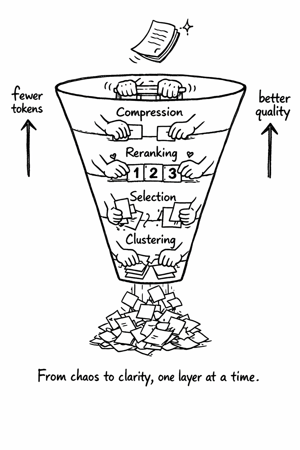 Context engineering operates in four layers, each addressing a different problem. These layers form a pipeline: raw retrieved content enters at the bottom and curated, compressed context exits at the top. Each layer reduces token count while preserving - or improving - information quality. Understanding these layers is essential because most teams only implement retrieval (getting chunks from a vector database) and skip the post-retrieval processing that determines whether those chunks actually help the model.