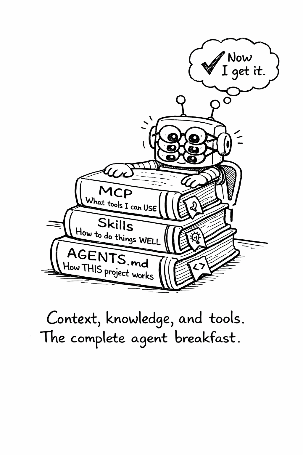 AGENTS.md provides the “where” - the specific conventions and structure of your project. Skills provide the “how” - the domain expertise for doing things well. MCP provides the “what” - the tools and data sources the agent can access at runtime. A well-configured agent has all three.