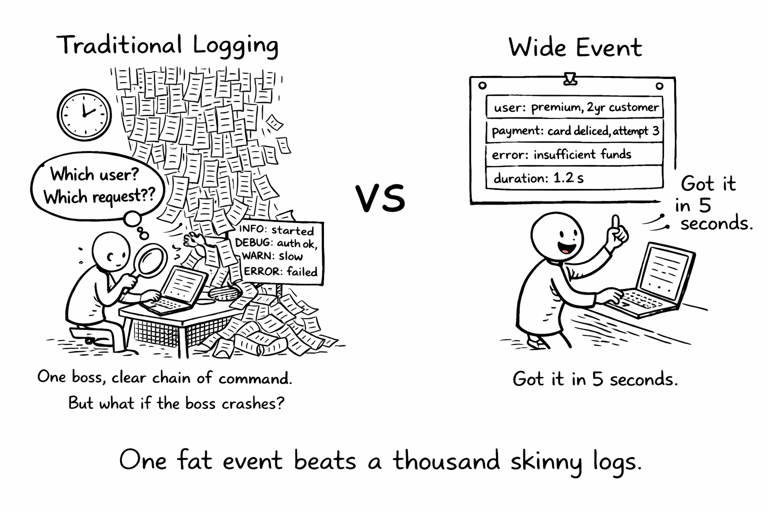 To make skills concrete, consider what a logging best practices skill would contain. The source material exists: Boris Tane’s loggingsucks.com (December 2025) identifies why traditional logging fails and prescribes wide events (also called canonical log lines, a term popularized by Stripe) as the fix. Tane led the Workers observability team at Cloudflare and founded Baselime, an observability startup acquired by Cloudflare - he has production credibility on this topic.