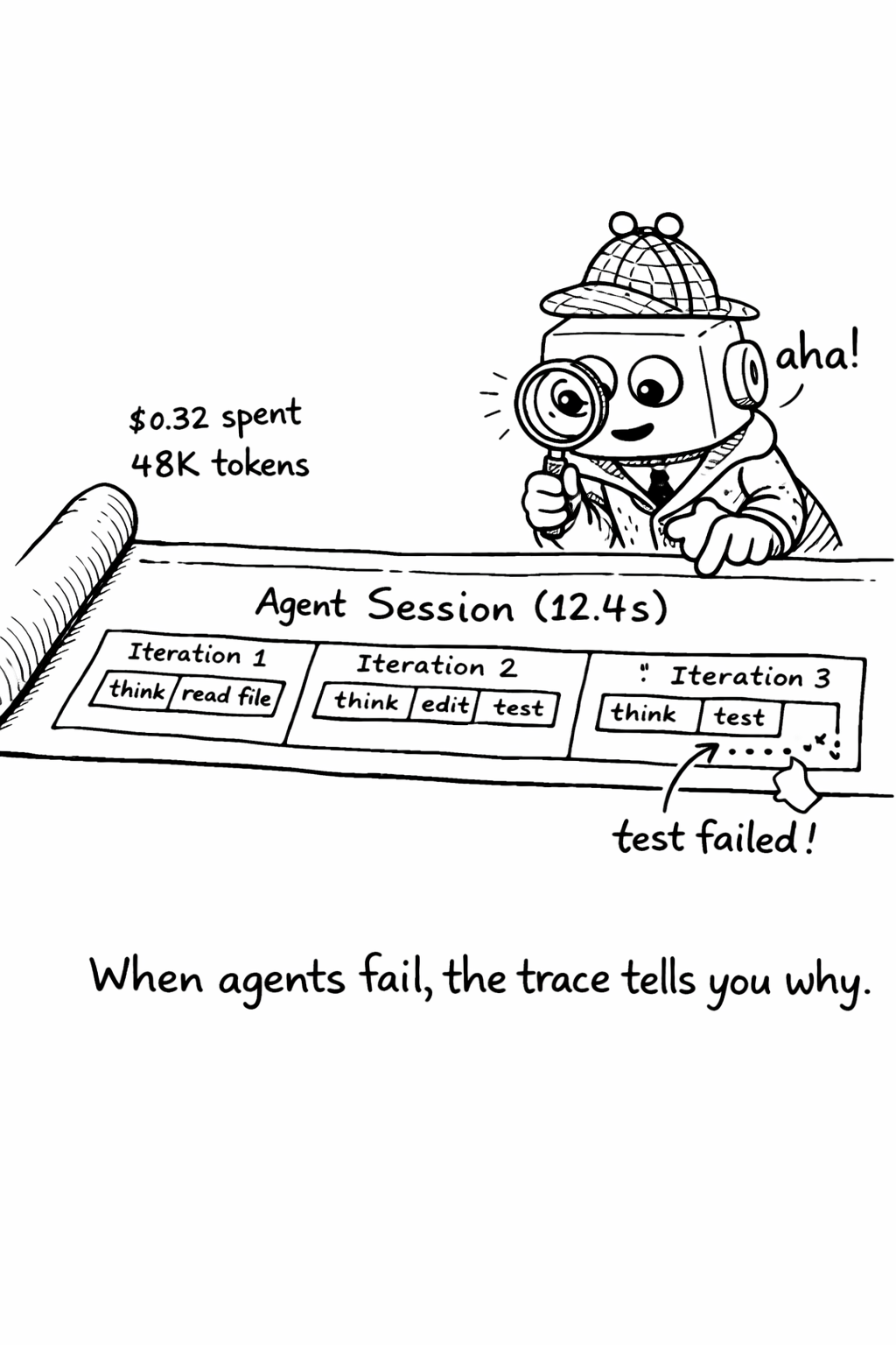 A well-instrumented agent session produces a trace that reads like a story. The top-level span shows the complete session - task description, total duration, total cost, and outcome. Nested within it are the loop iterations, each showing what the agent decided to do and why. Within each iteration are the individual tool calls and LLM requests, with their timing, cost, and results.